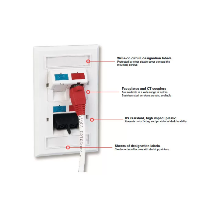 En el área de trabajo, las placas frontales CT de Siemon ofrecen una apariencia elegante y limpia para el montaje de acopladores CT. Las etiquetas de designación cubren los tornillos de montaje (incluidos) y proporcionan un amplio espacio para la identificación de circuitos.