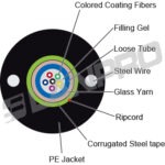 Serie Mini Armadillo de Cables Miniatura de Fibra óptica para exteriores con un tubo suelto con gel, chaqueta simple de PE con cinta de acero corrugado, dos alambres de acero como miembro de fuerza, núcleo con bloqueo de agua con gel e hilo de rasgar.